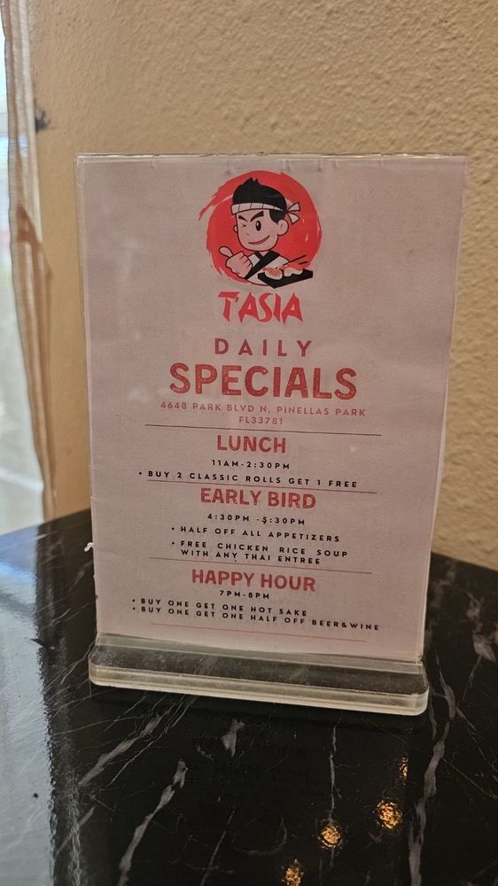 Welcome to T'asia Sushi & Thai, a delightful fusion of Thai flavors and sushi artistry located in Pinellas Park, FL. This Asian-owned gem invites you to explore a menu that beautifully marries traditional Thai cuisine with the fresh elegance of sushi. Whether it's a casual lunch or a cozy dinner, T'asia offers an inviting atmosphere with options for outdoor seating and a private dining experience.